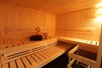 Wellnessbereich mit Sauna für bis zu 6 Person, Ruheliegen, Dusche mit Regenbrause, Schwallbrause und Massagedüsen für den Rücken, Luxus-Whirlpool für 3 Personen mit Massagedüsen, Luftdüsen, Farblichttherapie und Heizung. Ein Traum zum Entspannen und Abschalten.